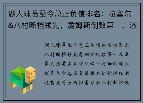 必威·BETWAY官方网站**摘要:** 本文将从四个方面对湖人球员至今总正负值排名进行详细阐述。首先,将分析拉塞尔和八村断档领先的原因;其次,探讨詹姆斯正负值倒数的可能原因;然后,深入探讨浓眉的排名情况及其相关影响;最后,对以上信息进行总结归纳。